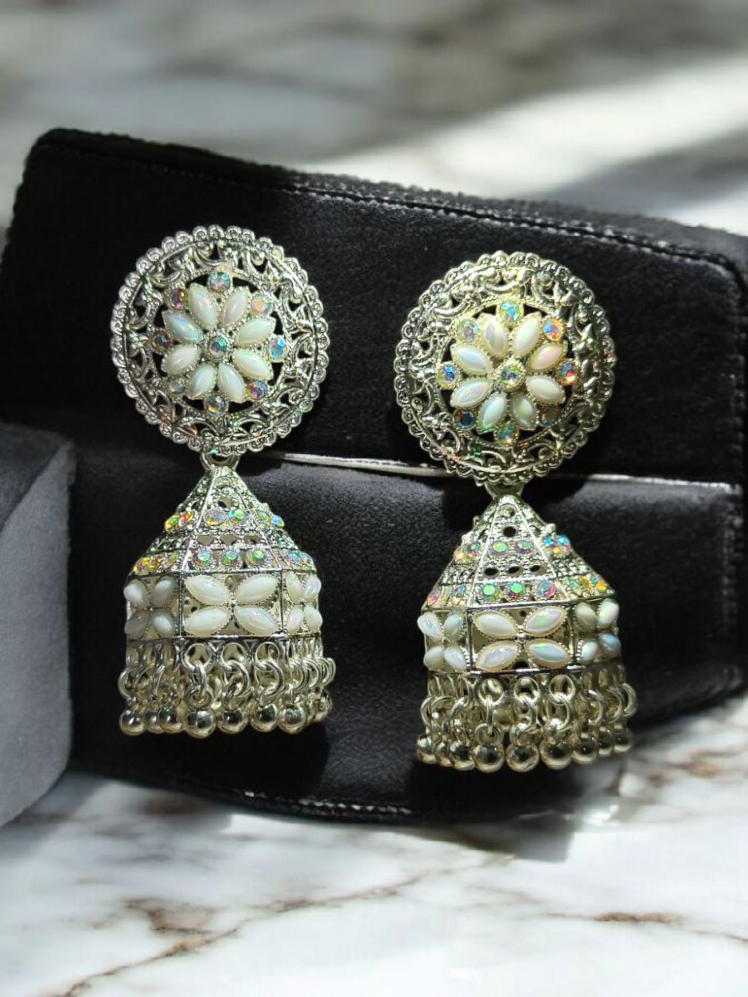 Elegant Oxidized Silver Floral White Stone Jhumka Earrings for Women and Girls - Festive and Wedding Wear