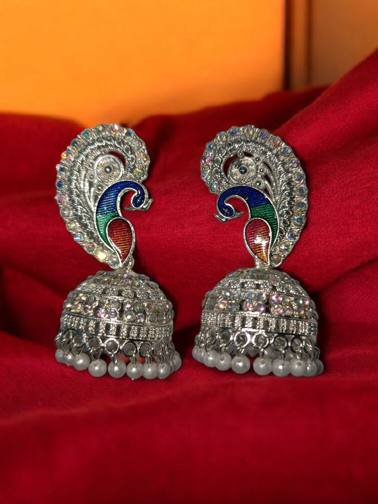 Elegant and eye-catching jhumka earrings featuring a detailed peacock design with multicolor enamel and premium stonework finish.